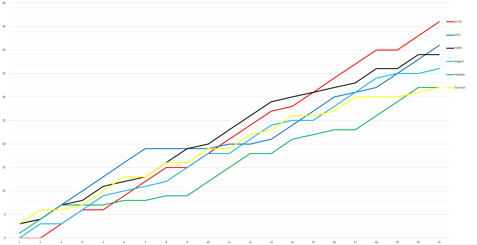 Az élmezőny csapatai pontszámának alakulása fordulónként